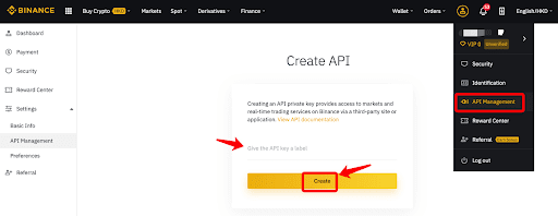 After logging into the Binance account, click [API Management] in the user center drop-down box. After entering the API management page, set an API key (ie API name), and click [Create].
