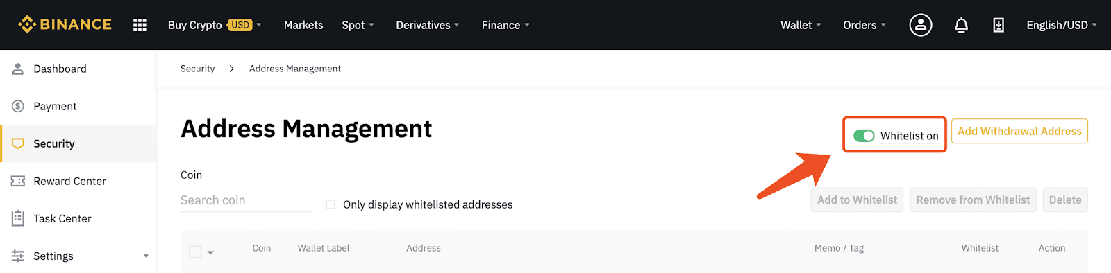 Click [Security] in the user center to get into [Address Management]. After entering [Address Management], click the button on the right side to enable the withdrawal address whitelist function.