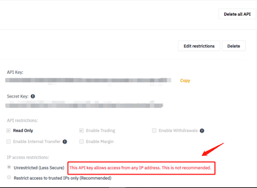 Click [Edit restrictions]. Please select [Restrict access to trusted IPs only], Enter KEYCO server IP Address [185.58.224.237] in the input field and Confirm. Click only Enable Withdrawals and Click Save.